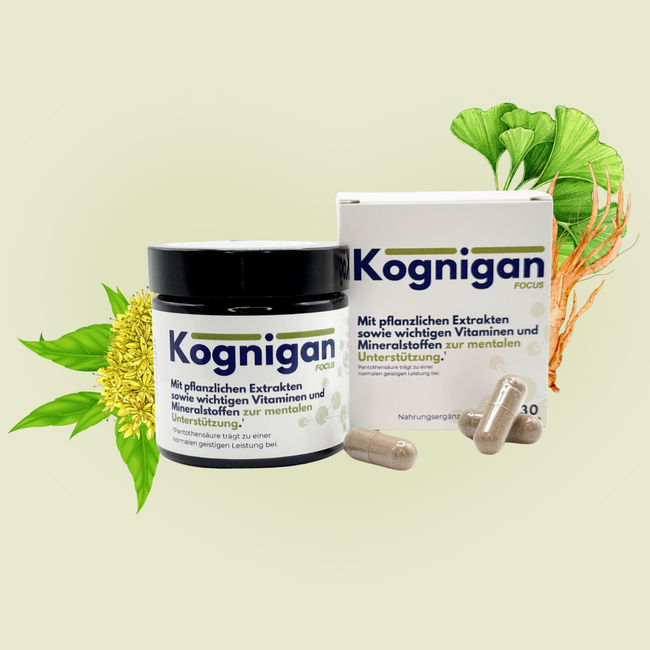 Kognigan ist ein intelligentes Nahrungsergänzungsmittel zur Unterstützung der geistigen Leistungsfähigkeit mit Vitaminen, Pflanzenextrakten und Omega-3 aus Leinsamen. Entwickelt für Menschen, die merken, dass Konzentration & Klarheit nachlassen und etwas dagegen tun wollen. Im Job, in der Familie, im Alltag.